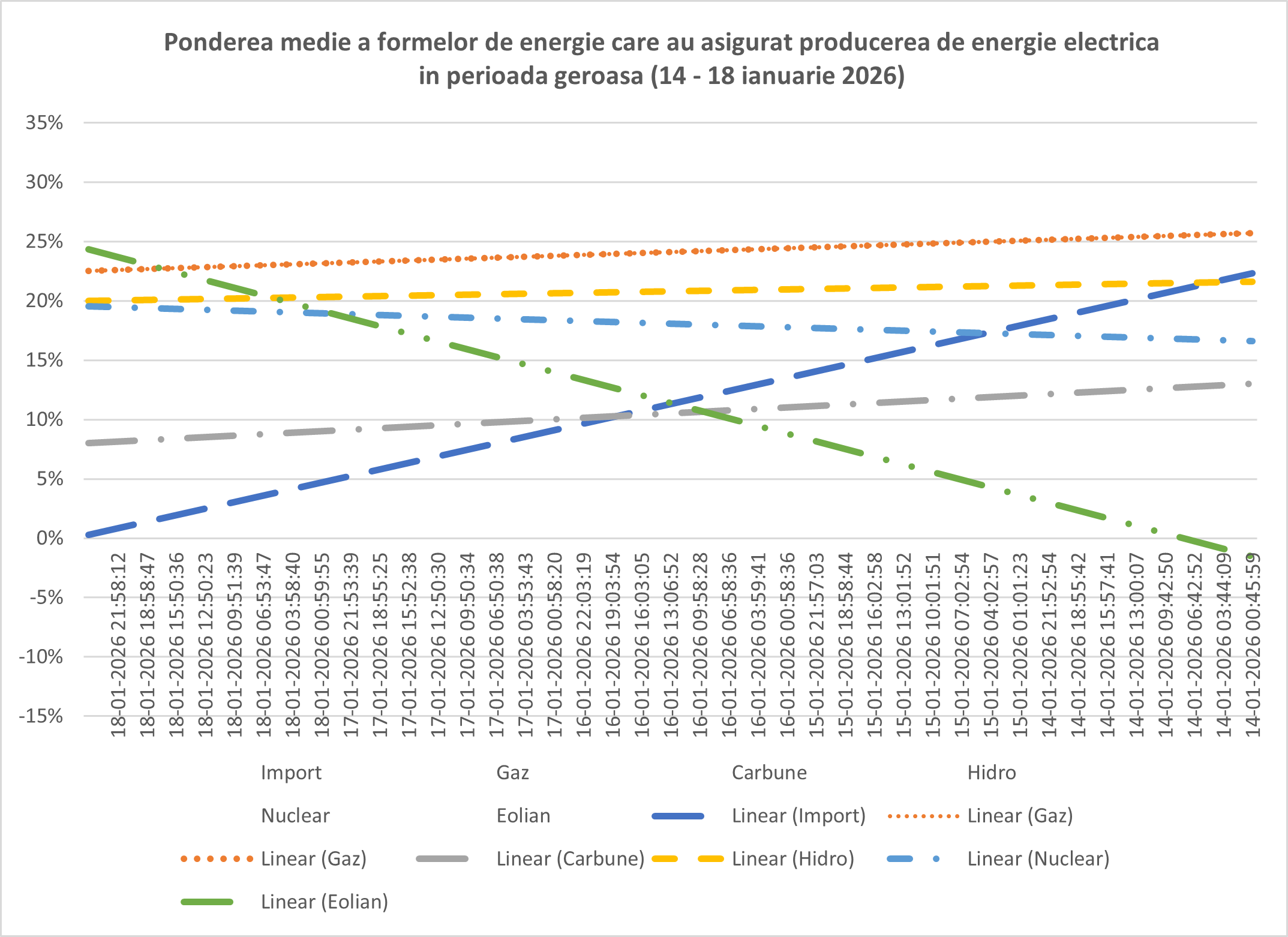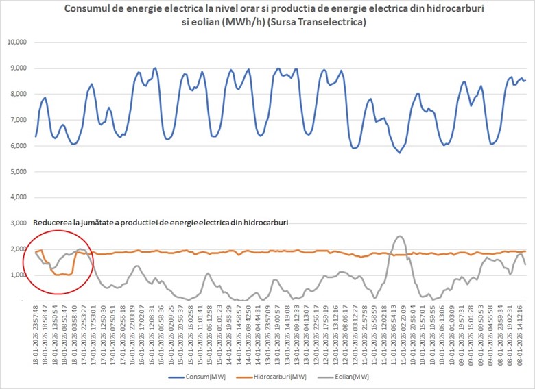 Și aici vine partea pe care nimeni nu ar trebui să o ignore: hidrocarburile folosite pentru producerea de energie electrică au scăzut la jumătate în noaptea 17-18 ianuarie și cu 25% în prima parte a zilei de 18 ianuarie. Nu vorbim de ajustări mici. Vorbim de schimbare de mix cu impact masiv: costuri de producție mai mici, presiune redusă pe piața gazelor, importuri mai mici, emisii mai mici și un sistem care respiră în loc să gâfâie.
