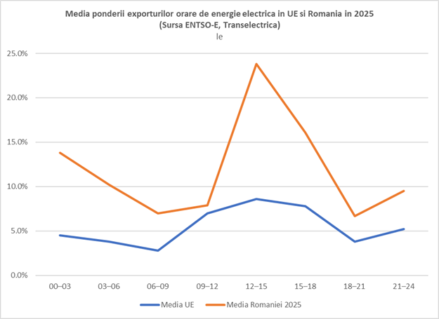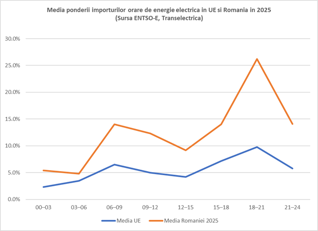 Ponderea importurilor/exporturilor medii în România 2025 — agregate pe intervale de 3 ore