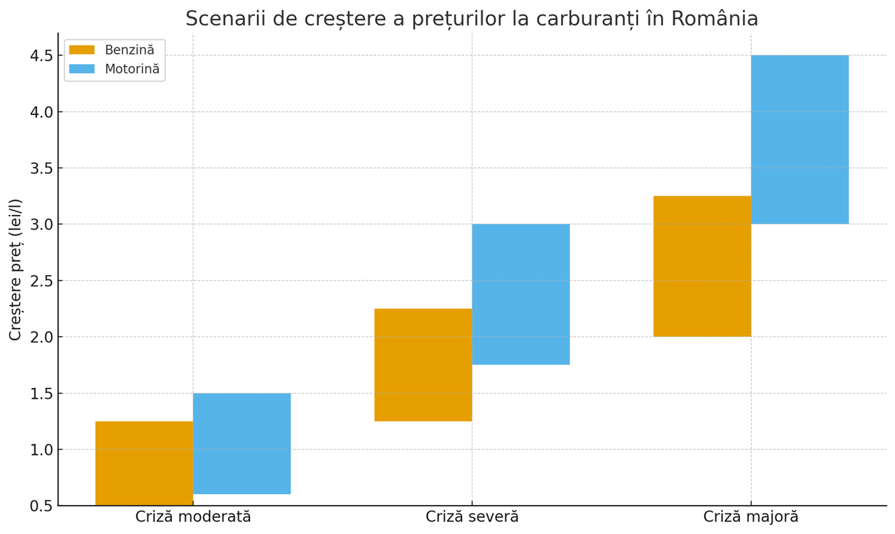 Într-o situație cu tensiuni regionale, sancțiuni suplimentare sau dificultăți minore de transport, benzina ar putea înregistra scumpiri între 0,50 și 1,25 lei pe litru, iar motorina între 0,60 și 1,50 lei pe litru.