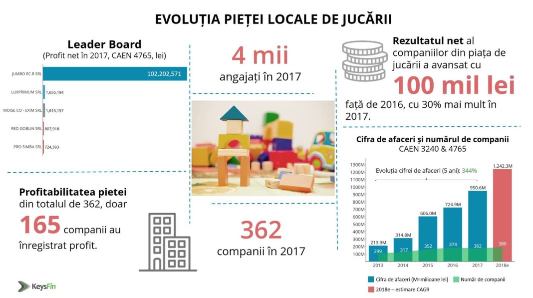 „De la replici de instrumente muzicale, la board games și drone, la jucării aspiraționale sau inspirate de industria de entertainement, industria și-a dezvoltat semnificativ ofertele, iar afacerile companiilor producătoare au evoluat cu un ritm de creștere excelent’’, afirmă analiștii. Potrivit KeysFin, datele preliminare din 2018 indică o cifră de afaceri cu aproape 200 de milioane de lei peste pragul de 1 miliard de lei. Comerțul reprezintă principalul motor al evoluției sectorului, generând 78% din cifra de afaceri, în creștere de la 72% față de 2016.