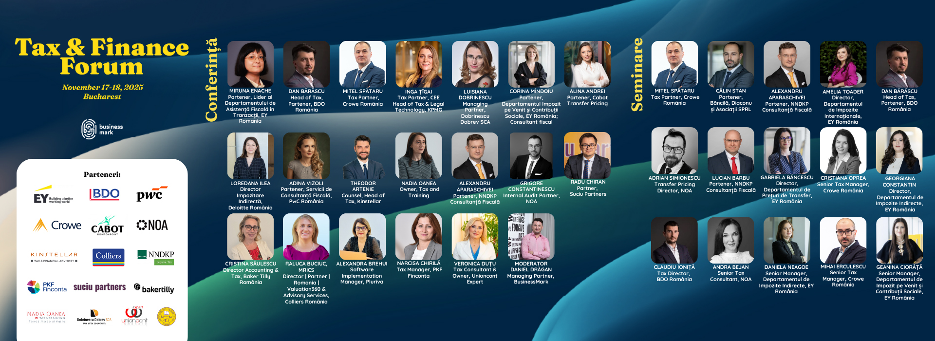 În contextul măsurilor de consolidare fiscală planificate de Guvern pentru 2025 și 2026, care anunță o perioadă de transformări accelerate, „Tax & Finance Forum” revine pe 17-18 noiembrie 2025 la Radisson Blu Hotel din București. Evenimentul, organizat de BusinessMark, se adresează directorilor financiari, managerilor de taxe și antreprenorilor, oferind soluții practice de adaptare la noile obligații fiscale și strategii de optimizare fiscală în cadrul legislativ actual.