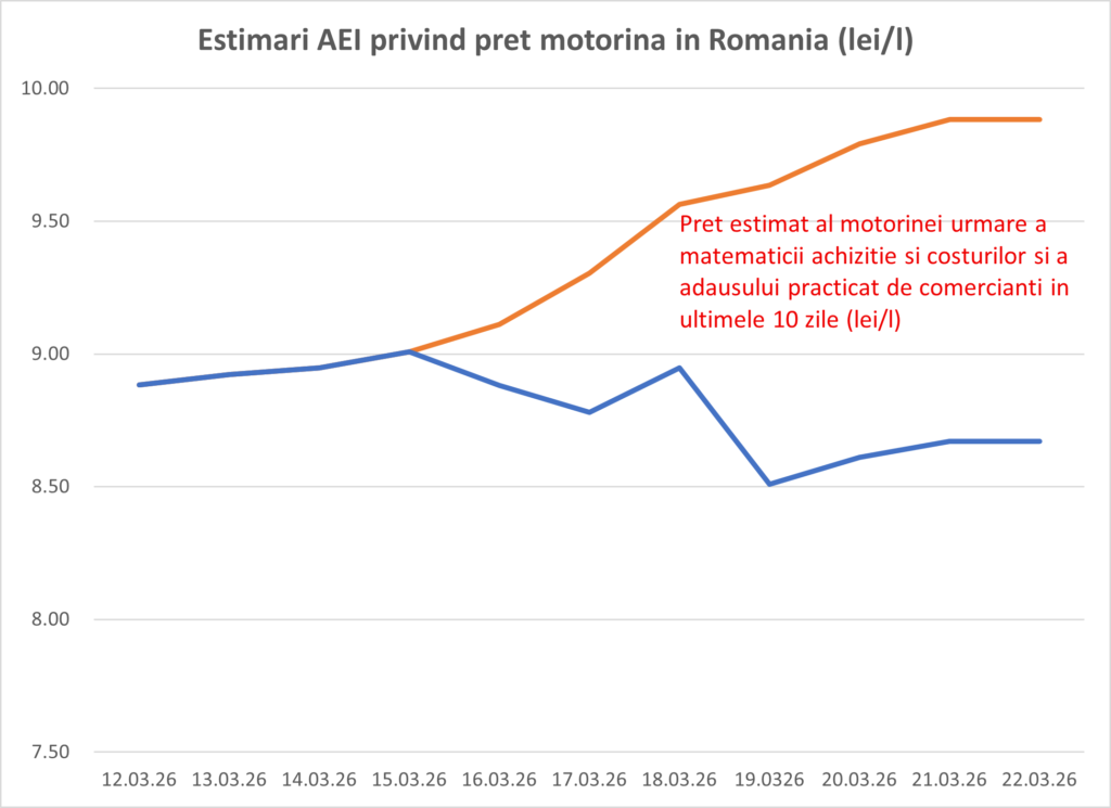 Introduse într-un model de calcul care include acciza, TVA, costurile logistice și marja comercială, aceste cotații conduc la o estimare foarte apropiată de realitatea din piață. Conform calculelor realizate de specialiștii din AEI, valoarea rezultată pentru motorină pentru data de 12 martie 2026, la marjele folosite în ultimele zile, este de aproximativ 8,81 lei pe litru, nivel care se regăsește, cu mici variații regionale, în prețurile de la pompă.