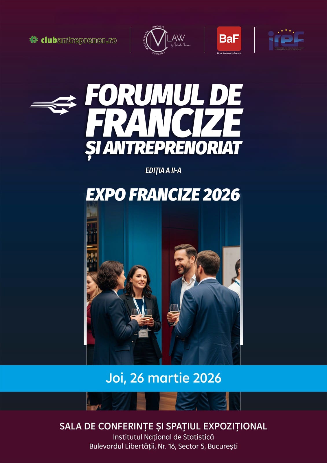 Club Antreprenor, CMV Law by Mihaela Mocanu și BaF – Biroul de Afaceri în Franciză organizează joi, 26 martie 2026, Forumul de francize și antreprenoriat, ediția a II-a și Expo Francize 2026.