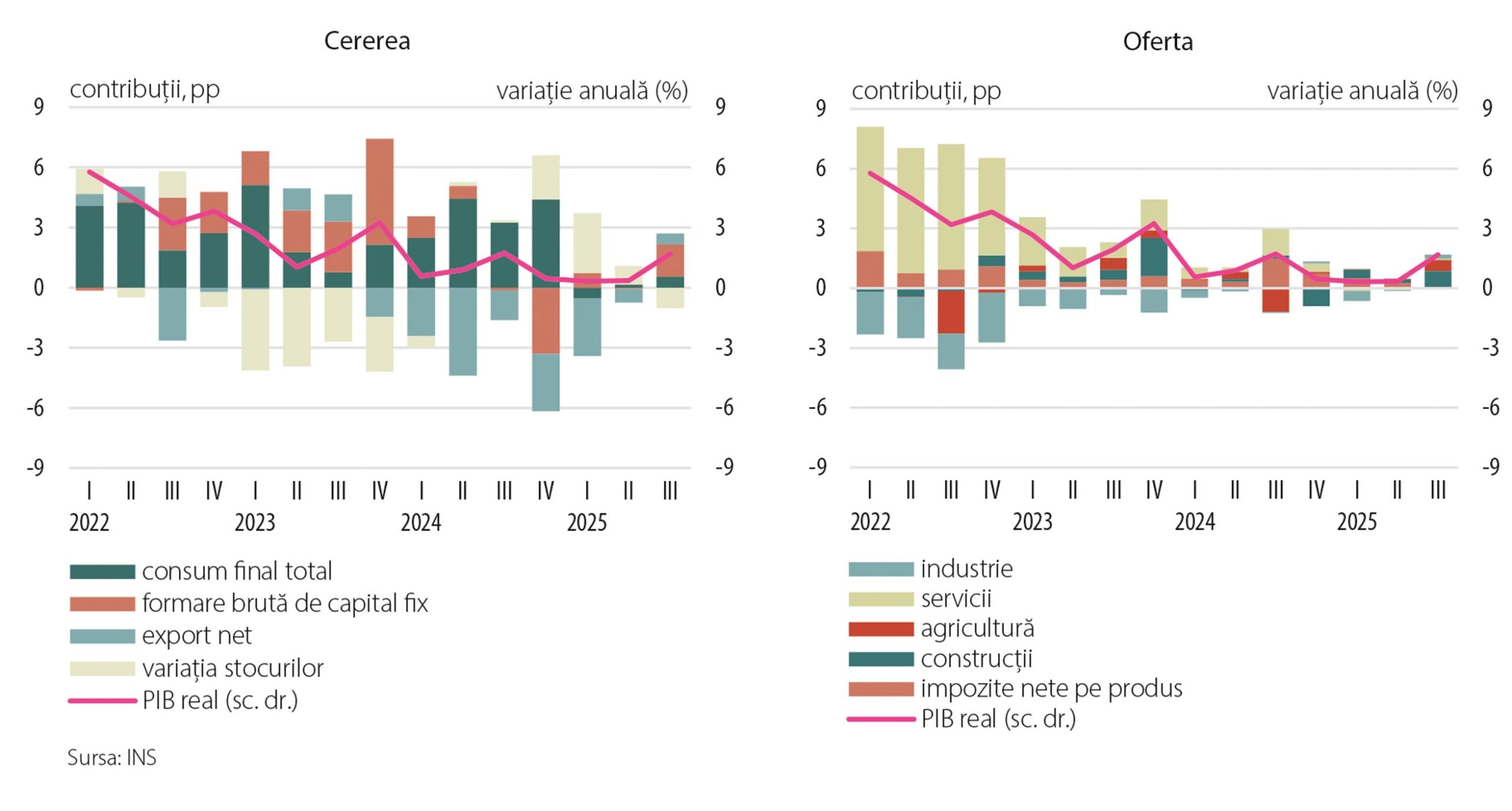 La nivelul ofertei, evoluția a fost atribuită în principal activității de construcții și agriculturii (contribuții de 0,8 puncte procentuale și, respectiv, 0,6 puncte procentuale la variația anuală a PIB real din trimestrul III), în timp ce VAB aferentă serviciilor a rămas aproape nemodificată, iar industria, deși în ușoară revenire, nu a avut un parcurs convingător. În acest din urmă caz, creșterea VAB cu 1,2 la sută în termeni anuali s-a datorat unui efect de bază (scădere în trimestrul III 2024 mai pronunțată decât cea din perioada curentă), o traiectorie anemică fiind vizibilă la nivelul livrărilor atât pe piața locală, cât și pe cea externă (reduceri trimestriale de peste 2 la sută ale cifrei de afaceri industriale în perioada curentă, în ambele cazuri).